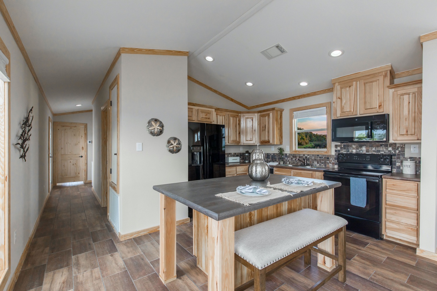 Here’s a first look at professional pictures of one of our newest homes in the Smart Cottage Line: The Mockingbird. This 2 bedroom, 1 bath, 775 sq. ft. home offers smarter and more luxurious living spaces than a typical tiny home. The Mockingbird is smarter in design, function, and energy-efficiency than a tiny house. Yet, still compact and comfortable. This home, like all Smart Cottage homes, features numerous standard features including: a wall of windows with clerestory windows in the Living Room, ceiling fans in every room, vaulted ceilings, LED lighting, GE appliances, Low-E thermal pane windows, 50-year warranty Smart Panel Siding, 60″ tile shower, and a 8′ deep covered front porch with porch swing.