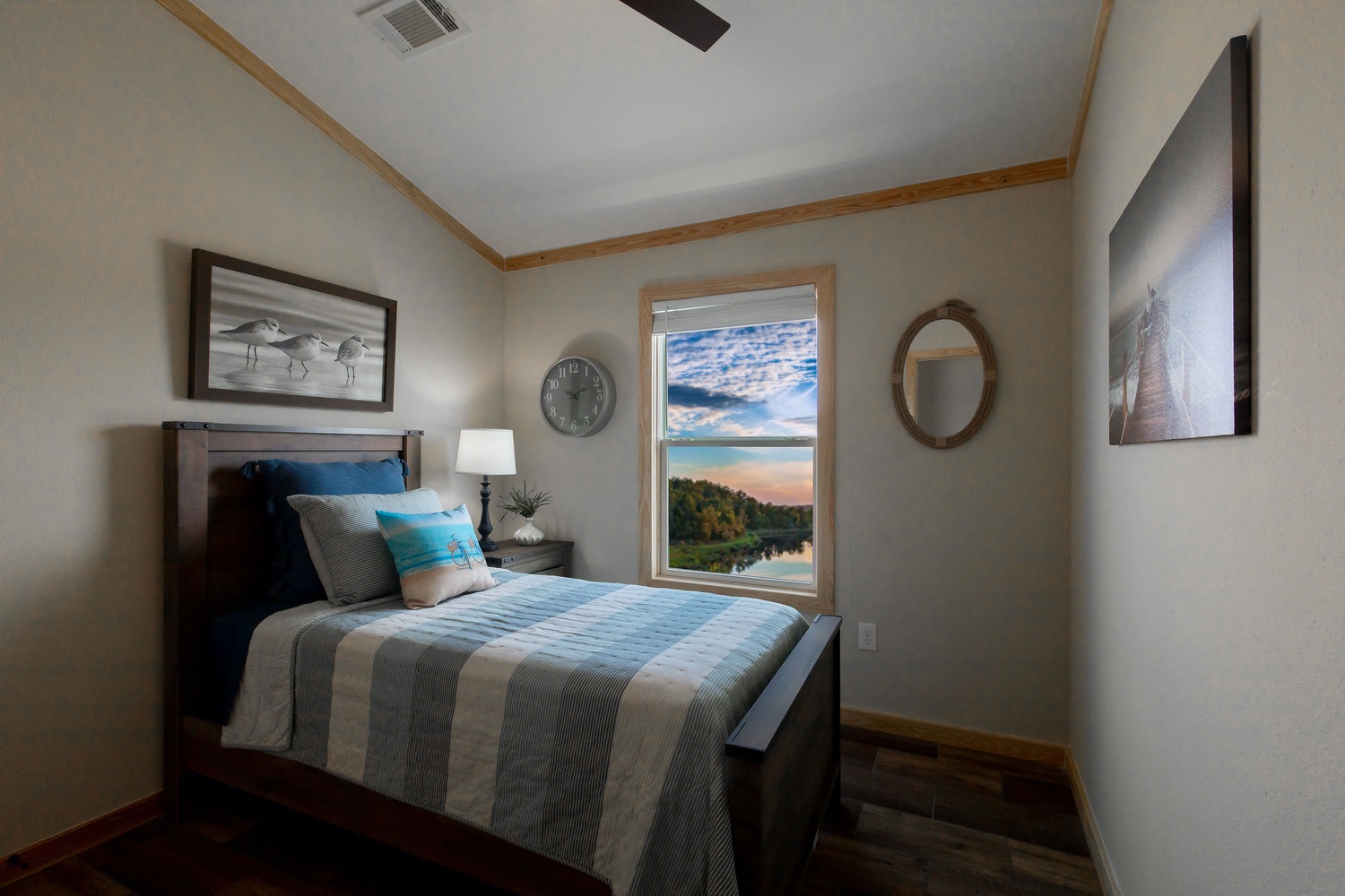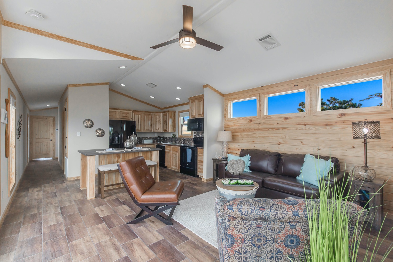 Here’s a first look at professional pictures of one of our newest homes in the Smart Cottage Line: The Mockingbird. This 2 bedroom, 1 bath, 775 sq. ft. home offers smarter and more luxurious living spaces than a typical tiny home. The Mockingbird is smarter in design, function, and energy-efficiency than a tiny house. Yet, still compact and comfortable. This home, like all Smart Cottage homes, features numerous standard features including: a wall of windows with clerestory windows in the Living Room, ceiling fans in every room, vaulted ceilings, LED lighting, GE appliances, Low-E thermal pane windows, 50-year warranty Smart Panel Siding, 60″ tile shower, and a 8′ deep covered front porch with porch swing.